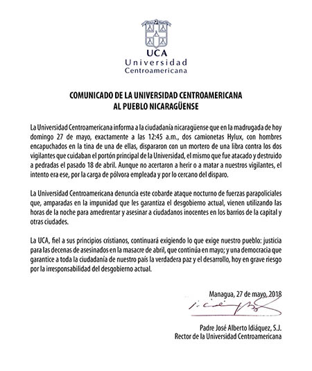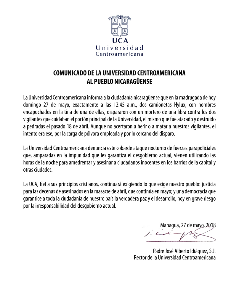 La Provincia Mexicana de la Compañía de Jesús condena el ataque con mortero del que fue objeto la Universidad Centroamericana (UCA), institución educativa jesuita en Nicaragua, la madrugada del domingo 27 de mayo.